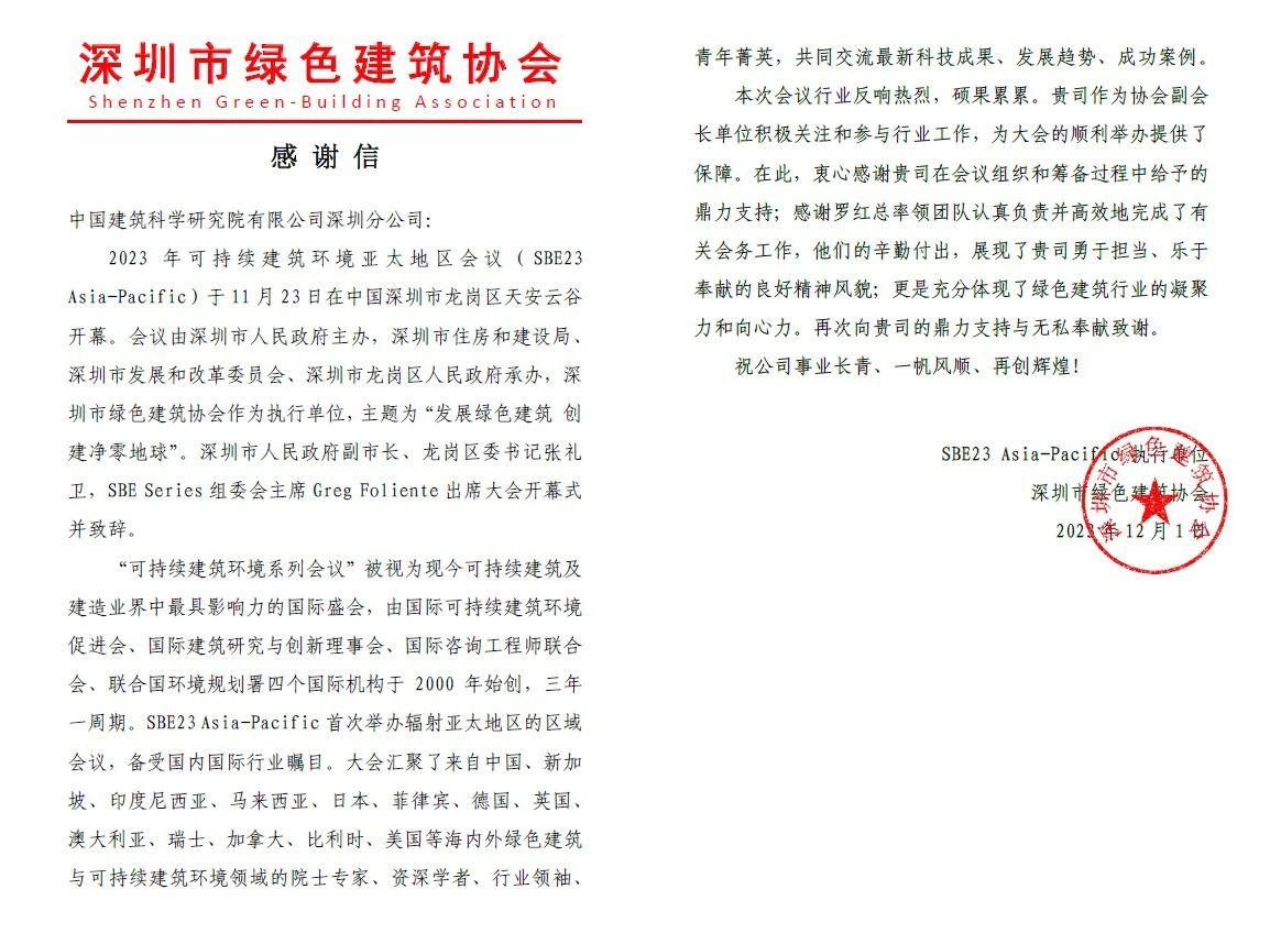 近期,深圳市綠色建筑協會向中國建研院深圳分公司發來感謝信,對中國建研院深圳分公司支持保障2023年可持續建筑環境亞太地區會議順利舉辦表示感謝。