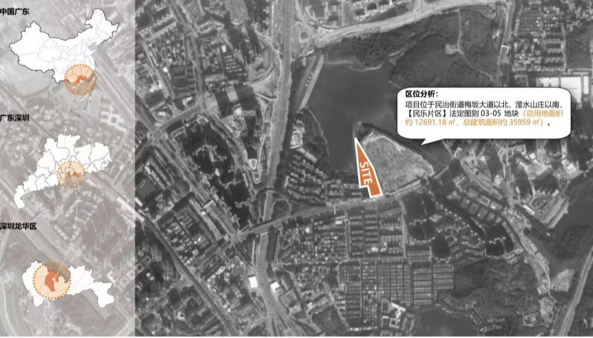項目位于龍華區民治街道梅坂大道以北,瀅水山莊以南。南側、西側和東側為二類居住用地,北側為水庫水面。學校總用地面積12691.18平方米,總建筑面積約35959平方米,擬建設一所36班/1620學位小學。