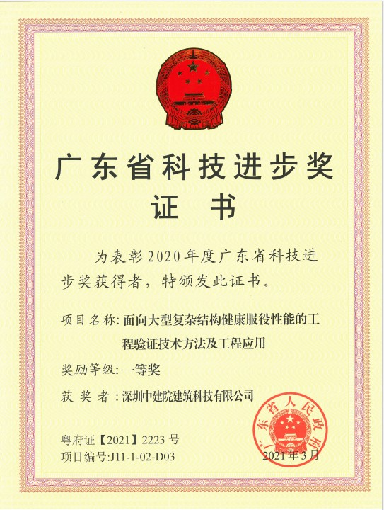 5月20日上午,廣東省科技創新大會在廣州召開,大會頒發了2020年度廣東省科學技術獎。深圳中建院建筑科技有限公司繼2018年之后,再度榮獲廣東省科學技術獎一等獎。獲獎項目《面向大型復雜結構健康服役性能的工程驗證技術方法及工程應用》,是以哈爾濱工業大學(深圳)(下稱哈工大)滕軍教授團隊、深圳中建院建筑科技有限公司(下稱深圳中建院)何春凱研究員等作為主要參與人,哈工大、中建四局、深圳中建院共同完成的課題。